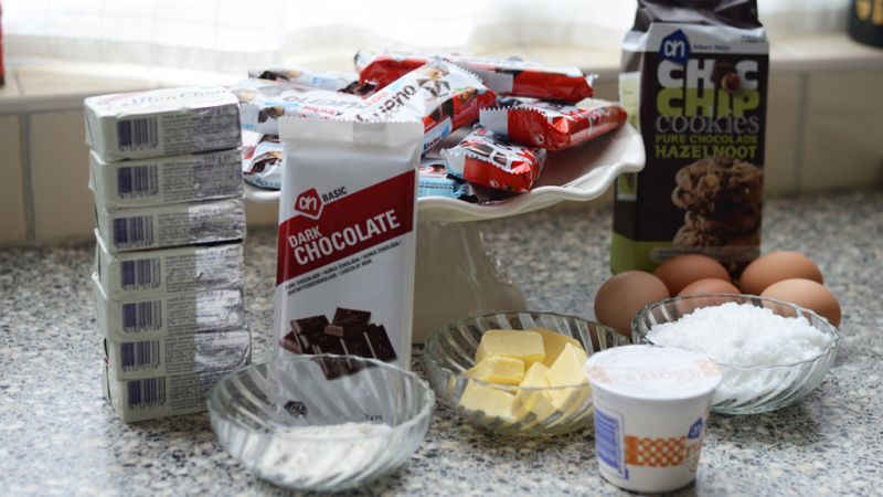 Bak dit 15 minuutjes in de oven. Hierna zet je het weg om af te koelen en zet je de oven op 200 graden. Ondertussen doe je de MonChou in een mengkom en mix je het tot een glad goedje. Maak 5 pakjes Kinder Bueno open(in totaal heb je dus 10 reepjes) en hak de inhoud plat in een kommetje.